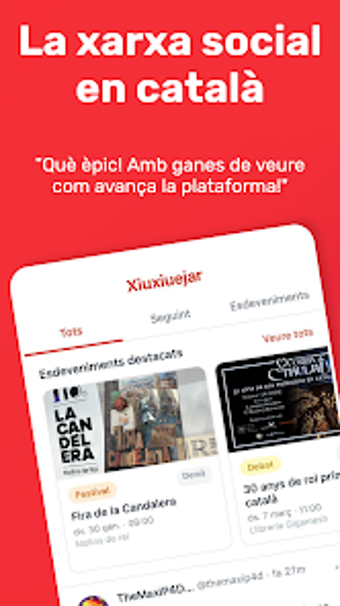 يوفر التطبيق ميزات مثل الاتصال بأفراد ذوي اهتمامات مشابهة، والترويج للفعاليات الشخصية، ومشاركة المنشورات والصور، كل ذلك باللغة الكاتالونية. إنه يعد موردًا قيمًا لأي شخص يعتز باللغة الكاتالونية، سواء كان مقيمًا في كاتالونيا أو في الخارج. يهدف Xiuxiuejar إلى تعزيز الروابط المجتمعية والاحتفال بالهوية الثقافية، مما يجعله أداة أساسية للمتحدثين باللغة الكاتالونية في كل مكان.